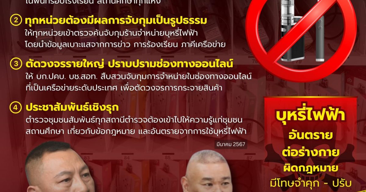 (1) เน้นย้ำให้ทุก สน.,สภ. สืบสวนจับกุมร้านจำหน่ายบุหรี่ไฟฟ้า ในพื้นที่โดยรอบโรงเรียน และสถานศึกษาทุกแห่ง ต้องทำให้สถานศึกษาเป็นเขตปลอดบุหรี่ไฟฟ้า