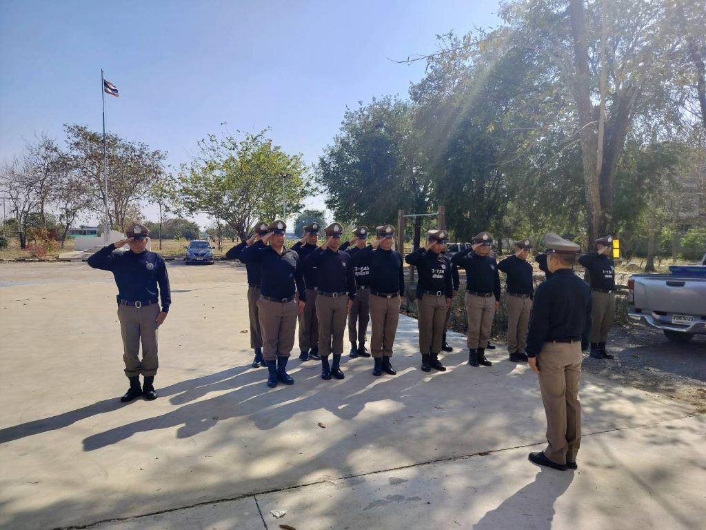 พ.ต.ต.สุรพันธ์ ธะสุนทร สวป.สภ.บ้านเหลื่อม นำกำลังพลข้าราชการตำรวจ สภ.บ้านเหลื่อม ฝึกประจำสัปดาห์ ณ ลานหน้า สภ.บ้านเหลื่อม